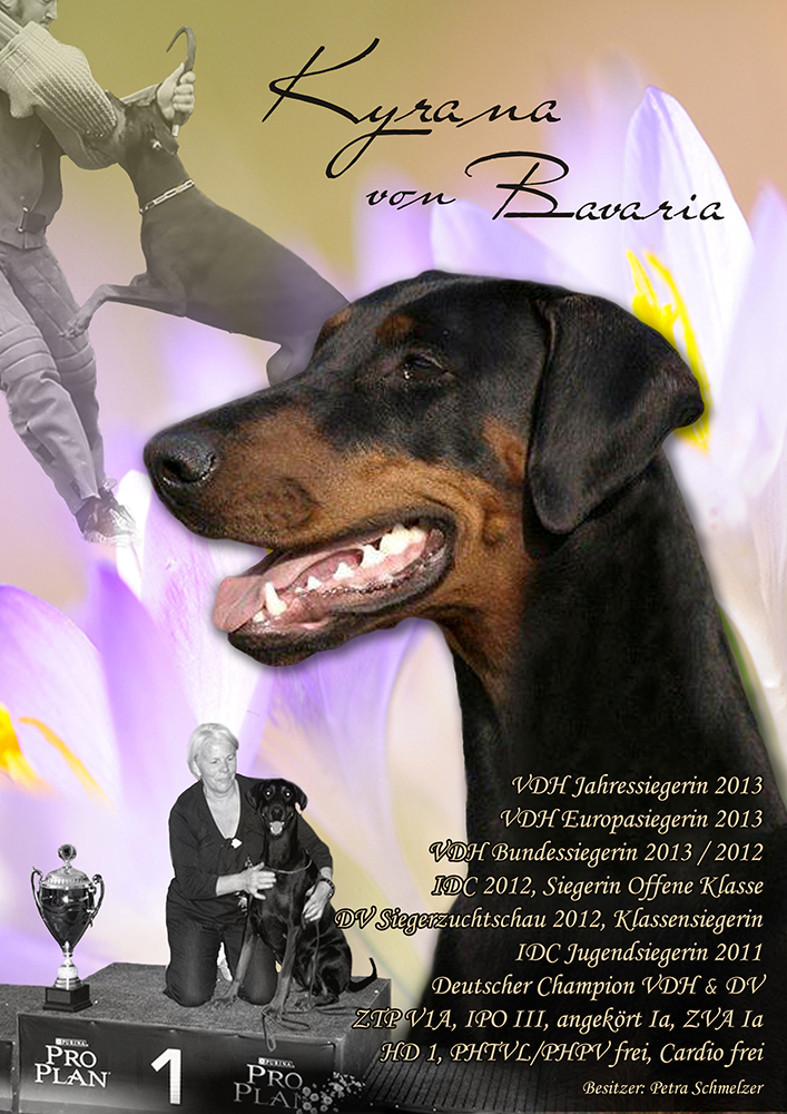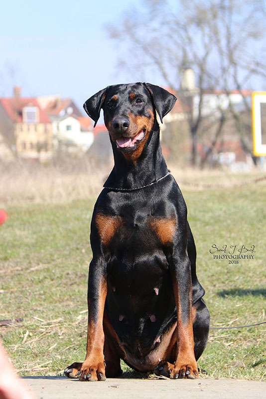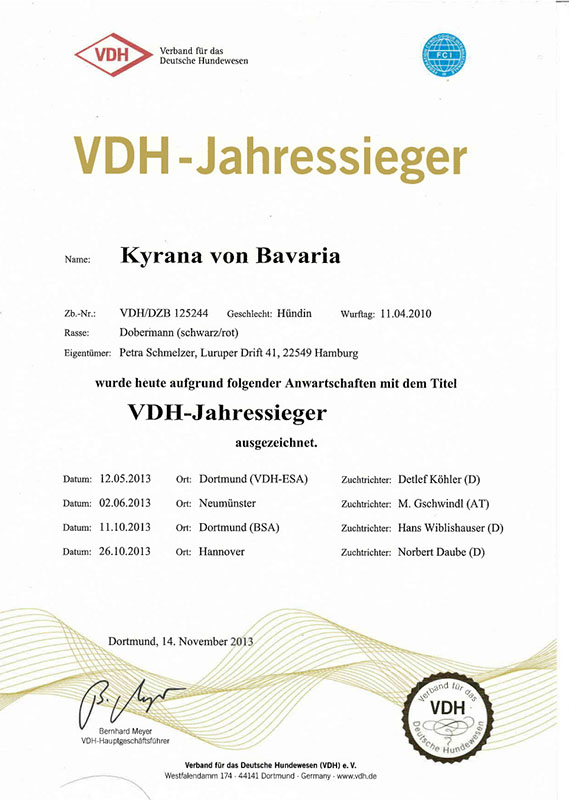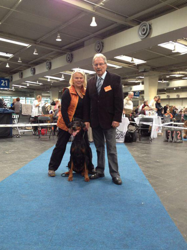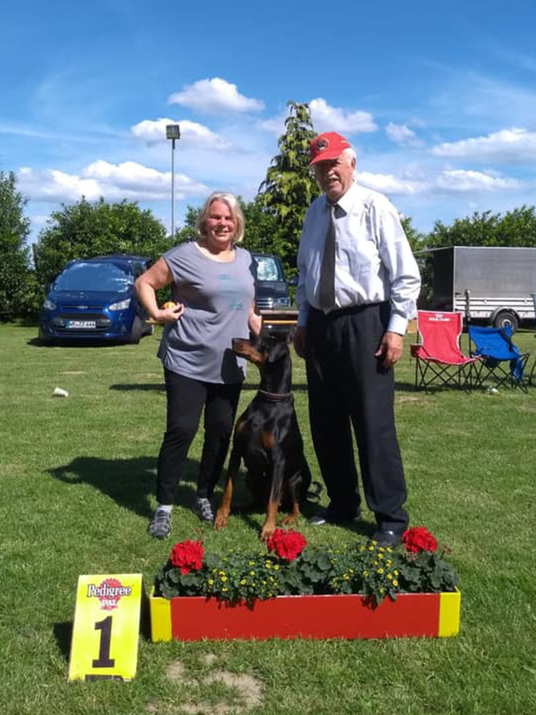 Babyklasse CAC Itzehoe 2010 (Armin Hoppe) - vv1 Jugendklasse IDC Ungarn 2011 (Thomas Bech) - V1, IDC Jugendsiegerin 2011 Offene Klasse DV-Siegerhauptzuchtschau 2012 (Dr. Pezzano) - V1, CAC, BOB LG Siegerschau Thüringen 2012 (Martin Geschwindl) - V1, CAC, LG Siegerin Thüringen 2012, BOB CAC Dortmund 2012 (Norbert Daube) - V1, CAC CACIB Hannover 2012 (Norbert Daube) - V1, CAC, CACIB, BOB IDC Italien 2012 (Norbert Daube) - V1, Vize-IDC Siegerin 2012 VDH Bundessiegerschau 2012 (Armin Hoppe) - V1, CAC, CACIB, VDH Bundessiegerin 2012, BOB VDH Europasiegerschau 2013 (Detlef Köhler) - V1, CAC, CACIB, VDH Europasiegerin 2013, BOB German Winner Show Leipzig 2013 (Armin Hoppe) - V1, CAC, res-CACIB CACIB Neumünster 2013 (Martin Geschwindl) - V1, CAC, CACIB, BOB VDH Bundessiegerschau 2013 (Hans Wiblishauser) - V1, CAC, CACIB, VDH Bundessiegerin 2013 Gebrauchshundklasse CACIB Hannover 2013 (Norbert Daube) - V1, CAC, CACIB, BOB, VDH Jahressiegerin 2013 Veteranklasse Landessiegerschau Sachsen 2018 (Hans Wiblisbauser) - Platz 1 LG Siegerschau Nord 2019 (Hans Wiblisbauser) - Platz 1 |